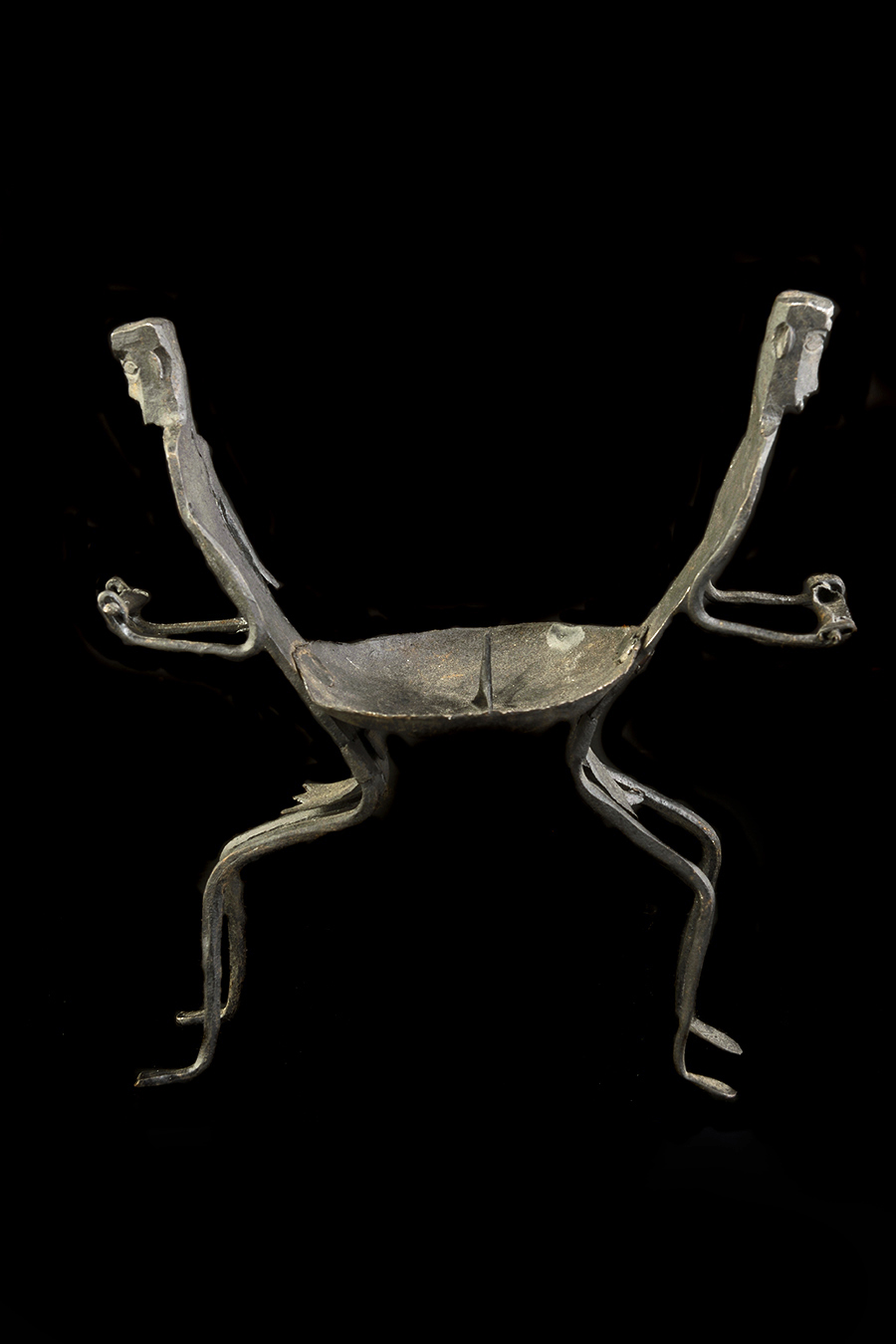A mould of soil is made malleable by adding resin and castor oil. After the molten metal has been poured into this mould, the cast piece is smoothened by filing for a shiny look and feel. This casting is coated with a concentrated solution of copper sulphate that provides it with a temporary black coating on which the designs are etched freehand.
